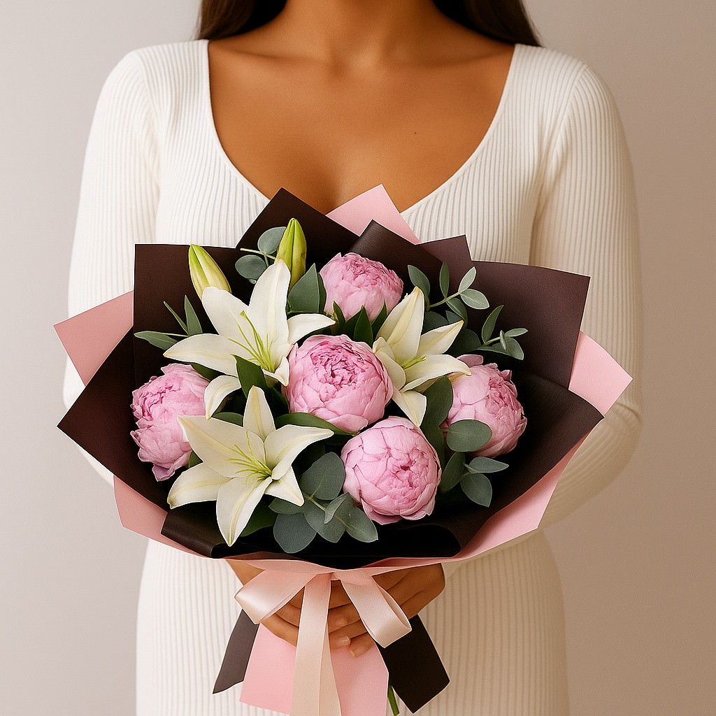 Утончённая композиция, сочетающая пышные пионы и изящные белоснежные лилии. Нежные розовые оттенки прекрасно гармонируют с элегантной зеленью эвкалипта, создавая лёгкий и романтичный образ. Такой букет станет идеальным подарком для особого случая, передавая атмосферу нежности, чистоты и искренних чувств.