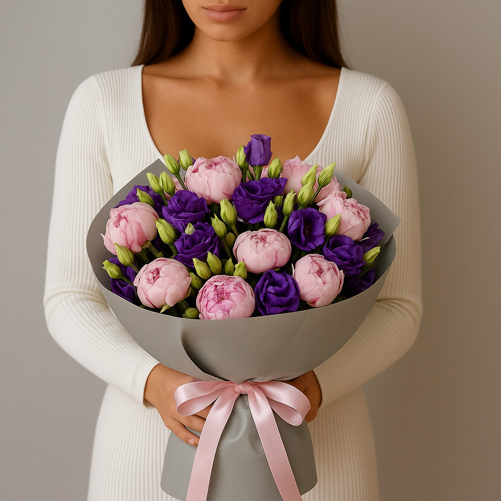Элегантная композиция, в которой нежные розовые пионы сочетаются с насыщенной фиолетовой эустомой. Контраст оттенков создаёт особую глубину и выразительность, а лаконичная упаковка подчёркивает изысканность букета. Такой подарок идеально подойдёт для особых случаев, выражая искренние чувства и внимание.