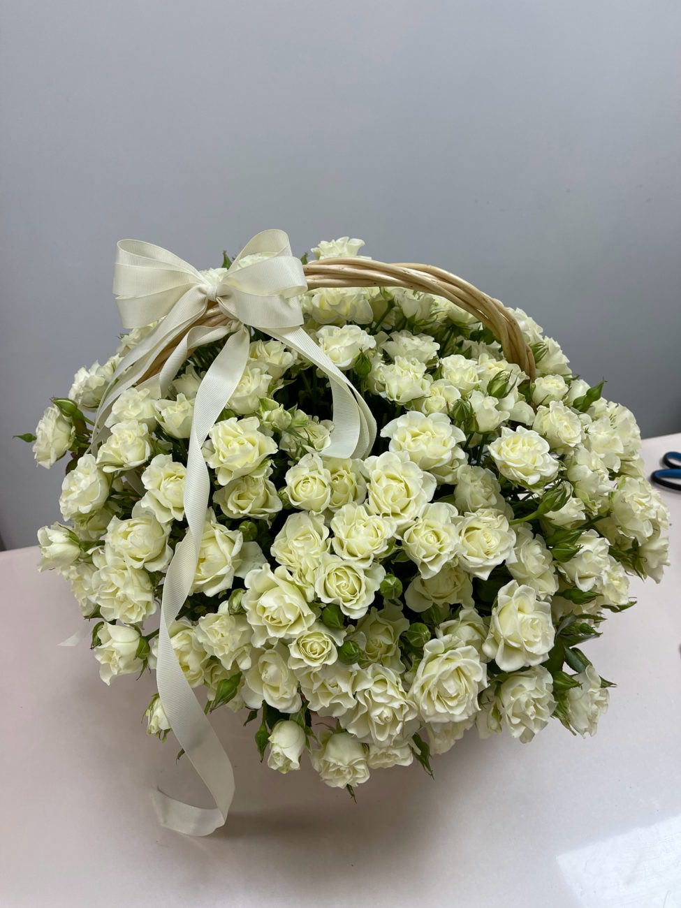 Корзина из белых кустовых роз - букет, который сохраняет свою грацию благодаря элегантному стилю