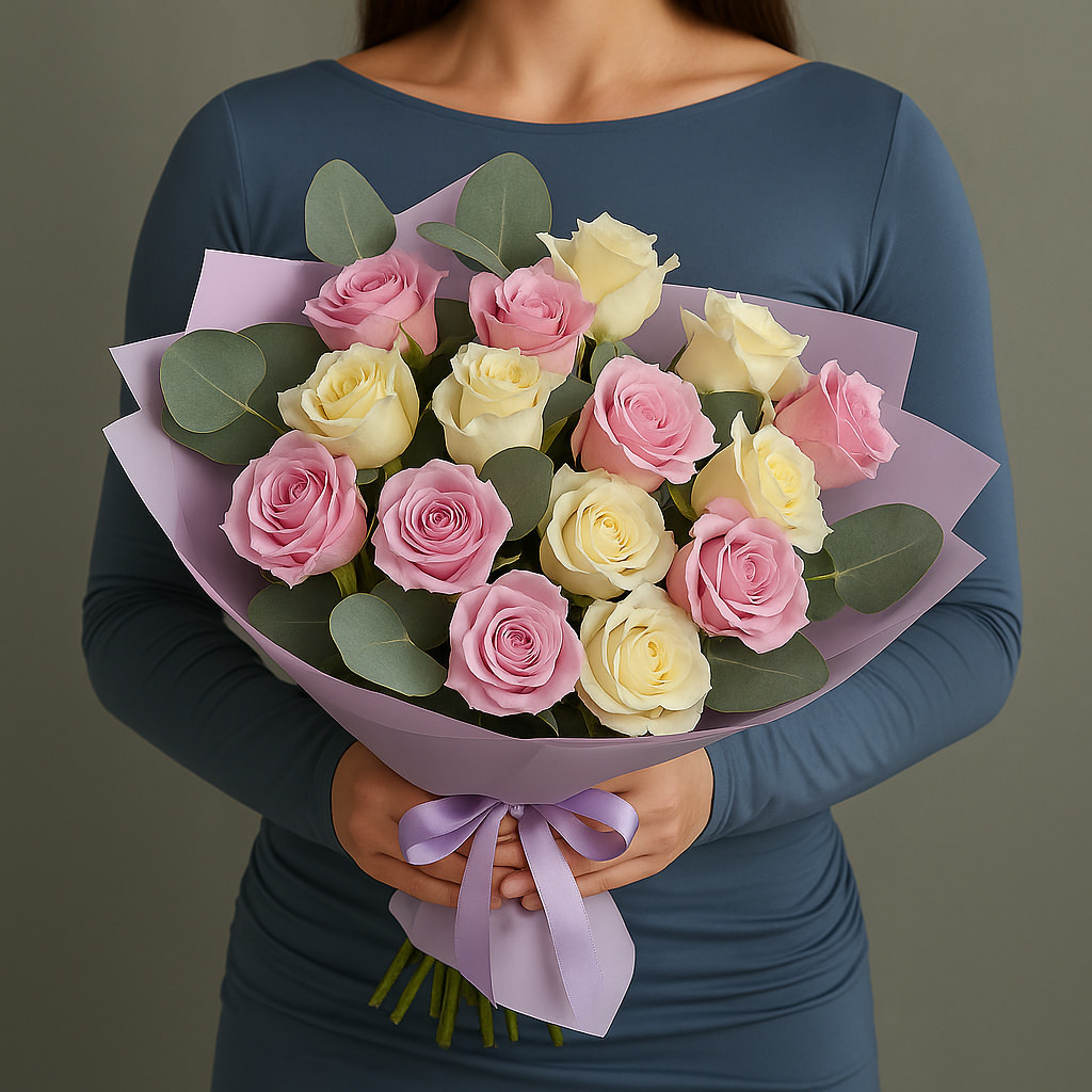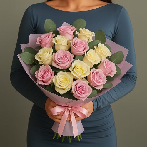Очаровательный букет роз в кремово-розовой гамме — это воплощение нежности и элегантности. Идеальный подарок для выражения искренних чувств, создания романтической атмосферы или поздравления с важным событием. Гармоничное сочетание пастельных оттенков и свежей зелени делает композицию универсальной и утончённой.