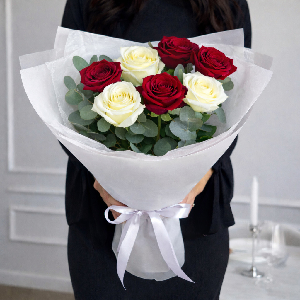 Изысканный букет из семи нежных роз — это гармония утончённой элегантности и искренних чувств. Светлые оттенки бутонов создают ощущение чистоты, тепла и спокойствия, наполняя пространство мягким светом. Воздушная упаковка и изящная атласная лента подчёркивают лёгкость композиции, делая букет прекрасным подарком для признания, поздравления или трогательного жеста внимания без лишних слов.