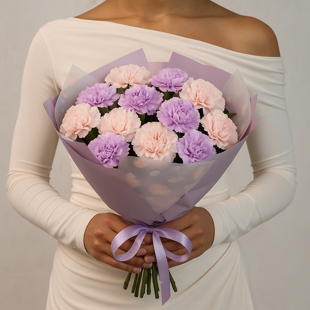 Нежная композиция из сиреневых и пудровых гвоздик в полупрозрачной лавандовой упаковке — утончённый подарок для самых тёплых признаний. Букет выглядит воздушно и аккуратно, долго сохраняет свежесть и идеально подходит для любого повода.