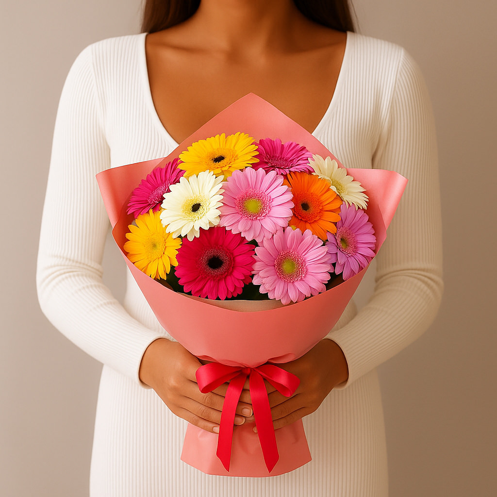 Насыщенный букет из разноцветных гербер словно собрал в себе все краски лета. Сочетание белых, жёлтых, розовых, оранжевых и фиолетовых оттенков делает композицию по-настоящему праздничной. Этот букет подарит восторг и вдохновение с первого взгляда.