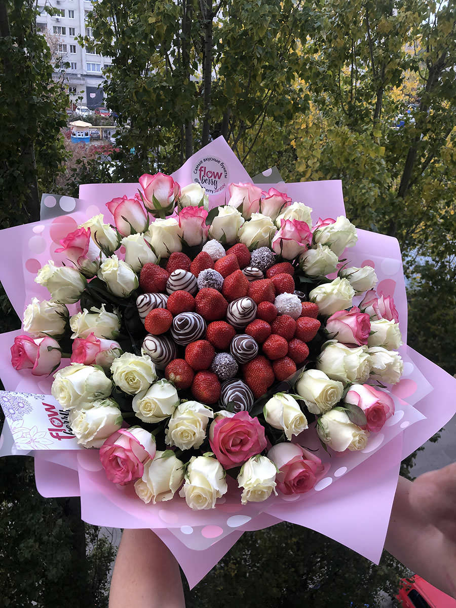Букет из клубники и роз «Дубай» - букет, который становится настоящим произведением искусства благодаря своему стилю и оформлению