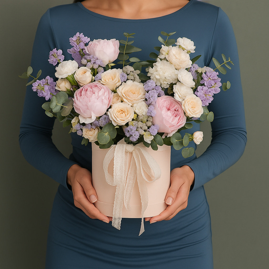 Композиция в пастельных тонах с пионовидными розами и полевыми акцентами создаёт лёгкое весеннее настроение. Подходит для подарка на день рождения или праздник.